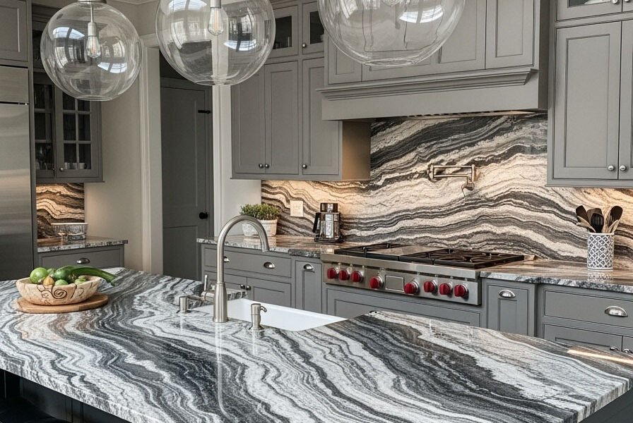 Le granit spectaculaire, avec ses vagues noires et blanches, est la star de cette cuisine. Il apporte un mouvement et un dynamisme incroyables. Les meubles gris de style shaker, classiques et élégants, offrent une toile de fond neutre qui permet à la pierre de s’exprimer pleinement. Les suspensions en verre ajoutent une touche de légèreté.