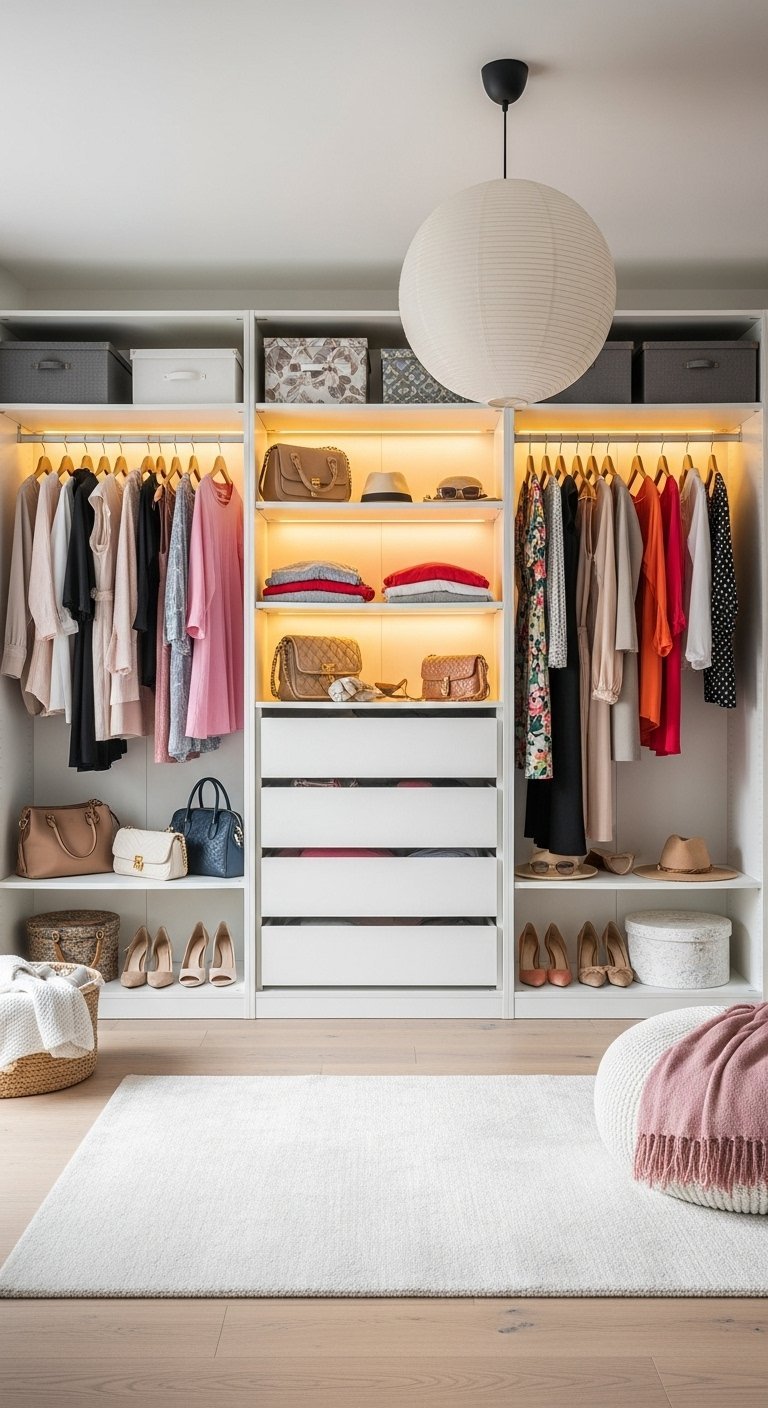 Ce dressing ouvert combine fonctionnalité et esthétique avec des modules blancs et un éclairage LED chaleureux intégré. Cette lumière met en valeur les vêtements et accessoires tout en créant une atmosphère douce et accueillante. L’utilisation de boîtes de rangement grises sur les étagères supérieures assure une organisation impeccable, tandis que le tapis blanc et le pouf ajoutent une touche de confort à l’espace.