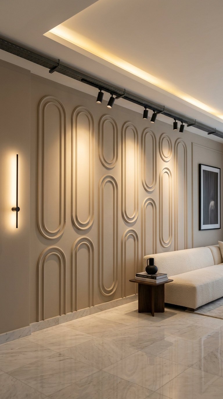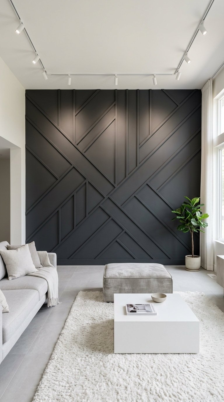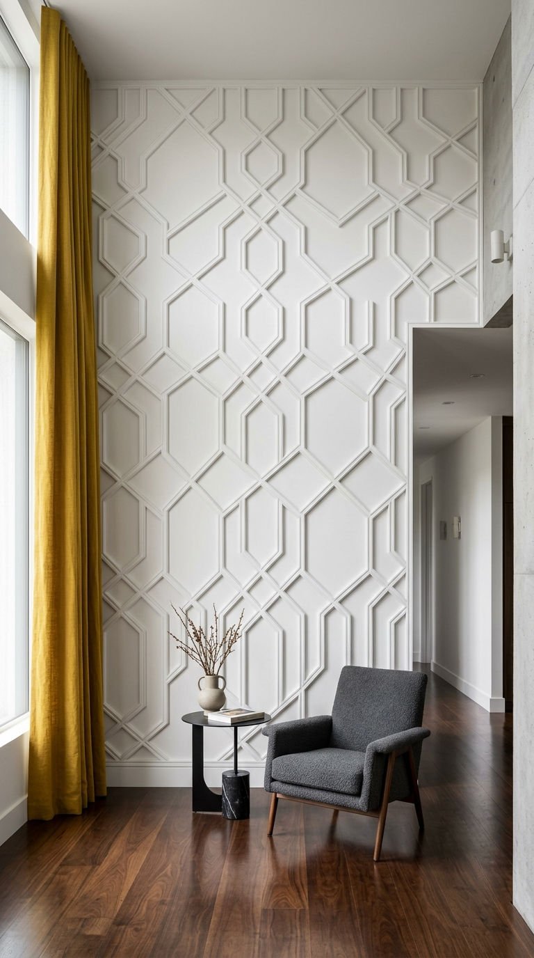 La puissance d’un gris sombre texturé par d’imposantes lignes entrecroisées redéfinit le caractère du salon. Cette moulure murale moderne sculpturale devient le point focal de la pièce, offrant un contraste saisissant avec la douceur du mobilier minimaliste environnant.