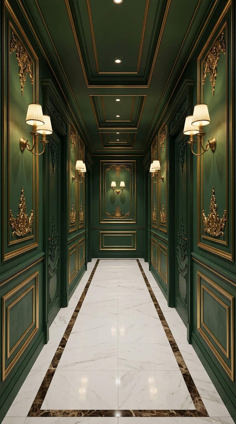 Ce couloir majestueux ose la couleur riche associée à des détails dorés finement sculptés. Cette approche maximaliste de la moulure murale moderne transforme une simple zone de passage en une galerie luxueuse, rappelant les fastes des anciens palais.