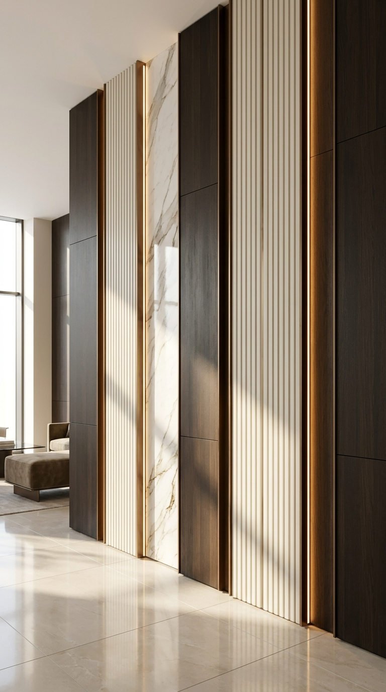 L’alternance de tasseaux boisés, de marbre et de rubans lumineux réinvente totalement la conception des murs. Cette variante audacieuse de la moulure murale moderne étire visuellement la hauteur sous plafond tout en apportant une ambiance intime et très contemporaine.