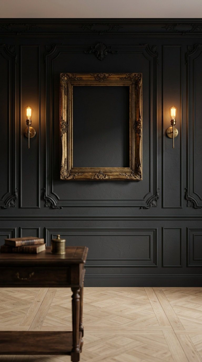 Plongez dans une atmosphère théâtrale avec cette finition mate profondément noire. La moulure murale moderne sert d’écrin somptueux pour mettre en exergue des cadres anciens ou des luminaires cuivrés, créant un contraste saisissant empreint d’une grande noblesse.