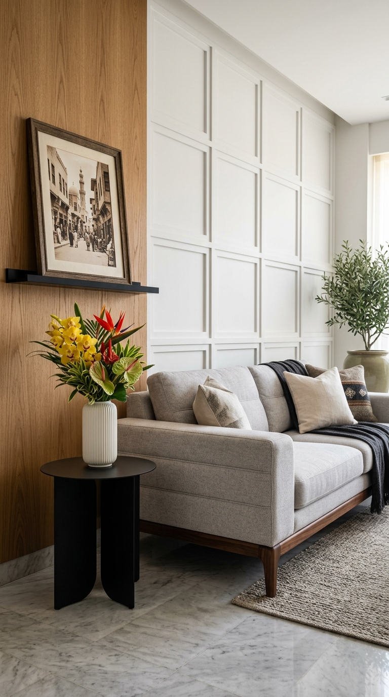 L’agencement rigoureux des panneaux rectangulaires instaure une harmonie visuelle apaisante. Cette moulure murale moderne sert de cadre idéal pour valoriser des appliques sculpturales et du mobilier coloré, prouvant que le classicisme épuré reste le summum de l’élégance intemporelle.