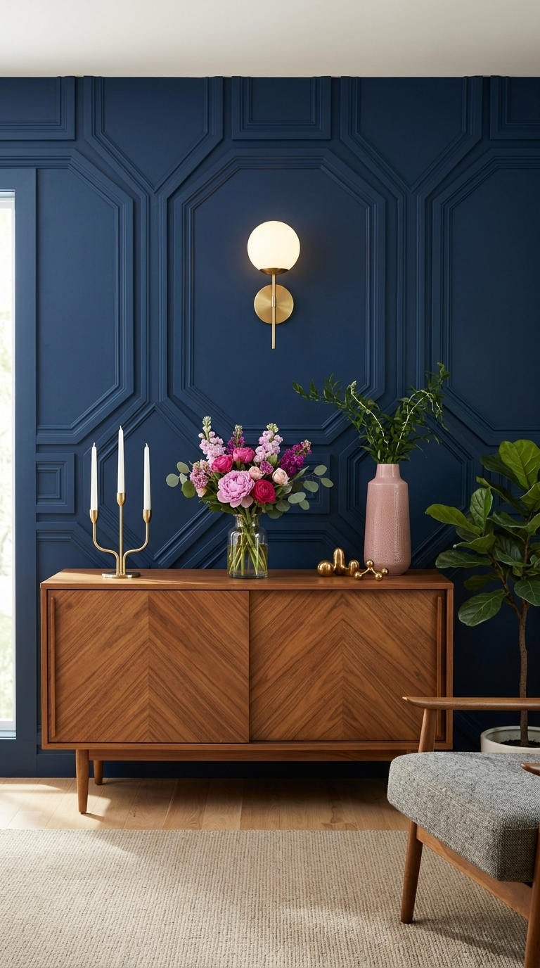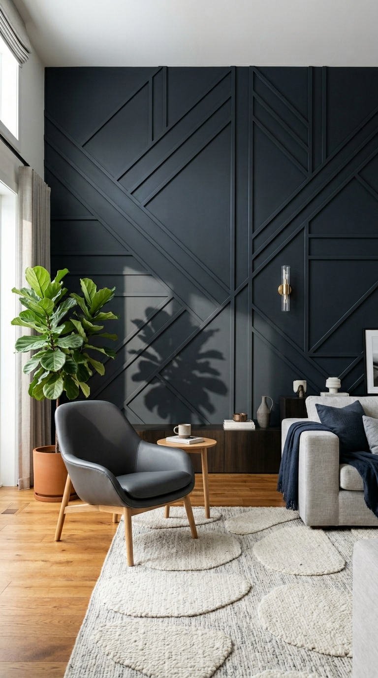 L’audace d’un bleu marine profond magnifie le motif géométrique complexe de cette moulure murale moderne. Ce relief architectural fort devient la pièce maîtresse du décor, contrastant avec le mobilier en bois chaleureux pour une ambiance feutrée et mystérieuse.