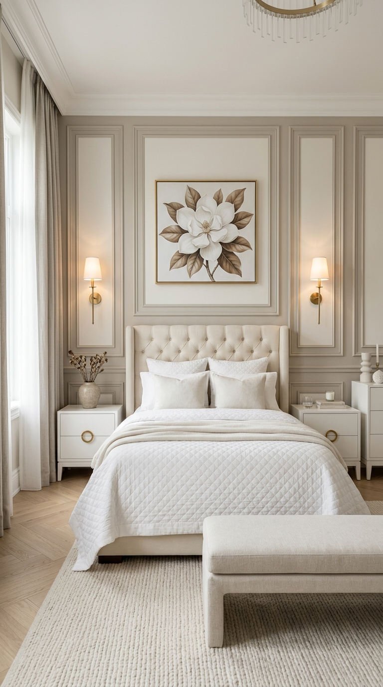 Dans cette chambre à coucher, les panneaux décoratifs ton sur ton instaurent une ambiance douce et feutrée. La moulure murale moderne structure l’espace nuit sans l’alourdir, offrant une toile de fond raffinée qui invite au repos et à la sérénité.