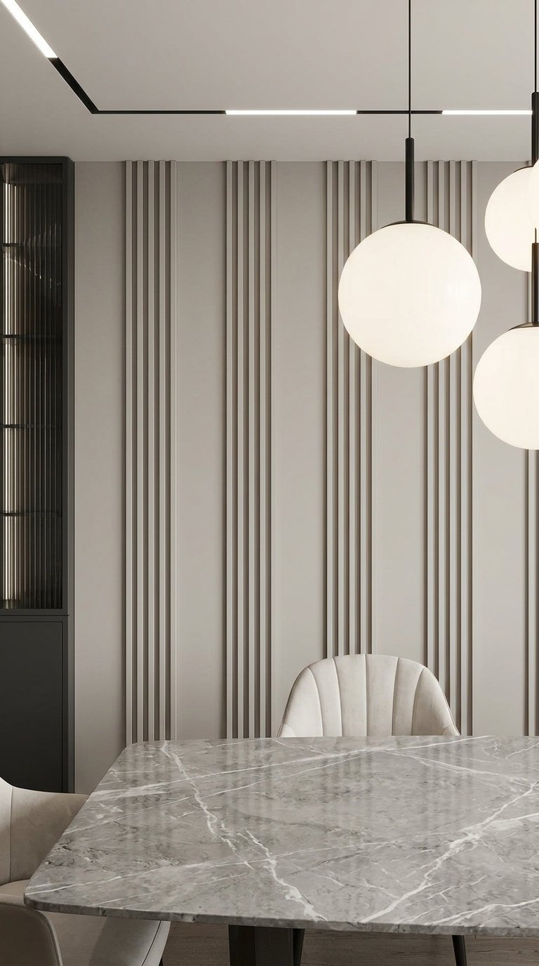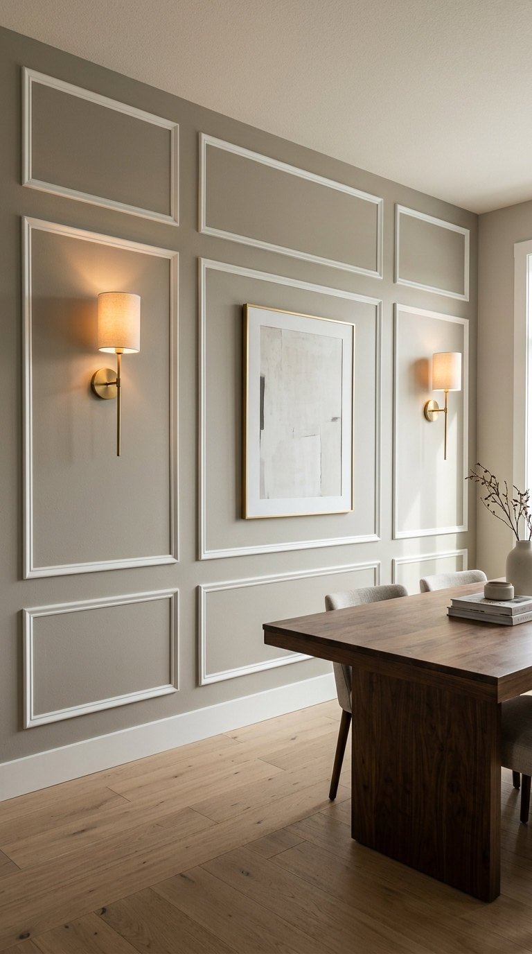 Dans cette salle à manger, la douceur du beige met en valeur la structure géométrique de la moulure murale moderne. Les appliques lumineuses chaleureuses soulignent avec subtilité les encadrements classiques, offrant un équilibre parfait entre tradition architecturale et design contemporain.