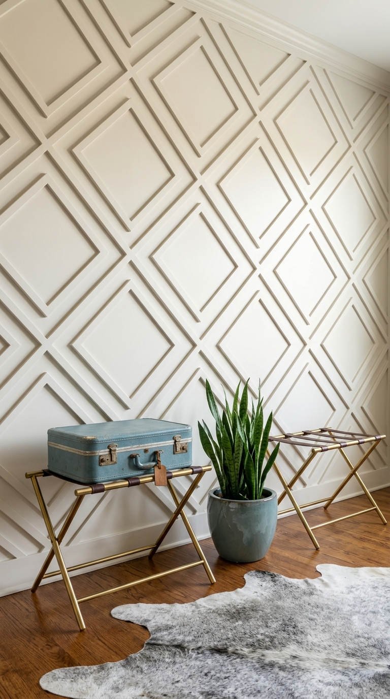 Un motif répétitif en diagonale apporte un dynamisme insoupçonné à une surface unie. Cette interprétation géométrique de la moulure murale moderne capte habilement les ombres, donnant du volume et une personnalité unique à cet espace de transition souvent oublié.