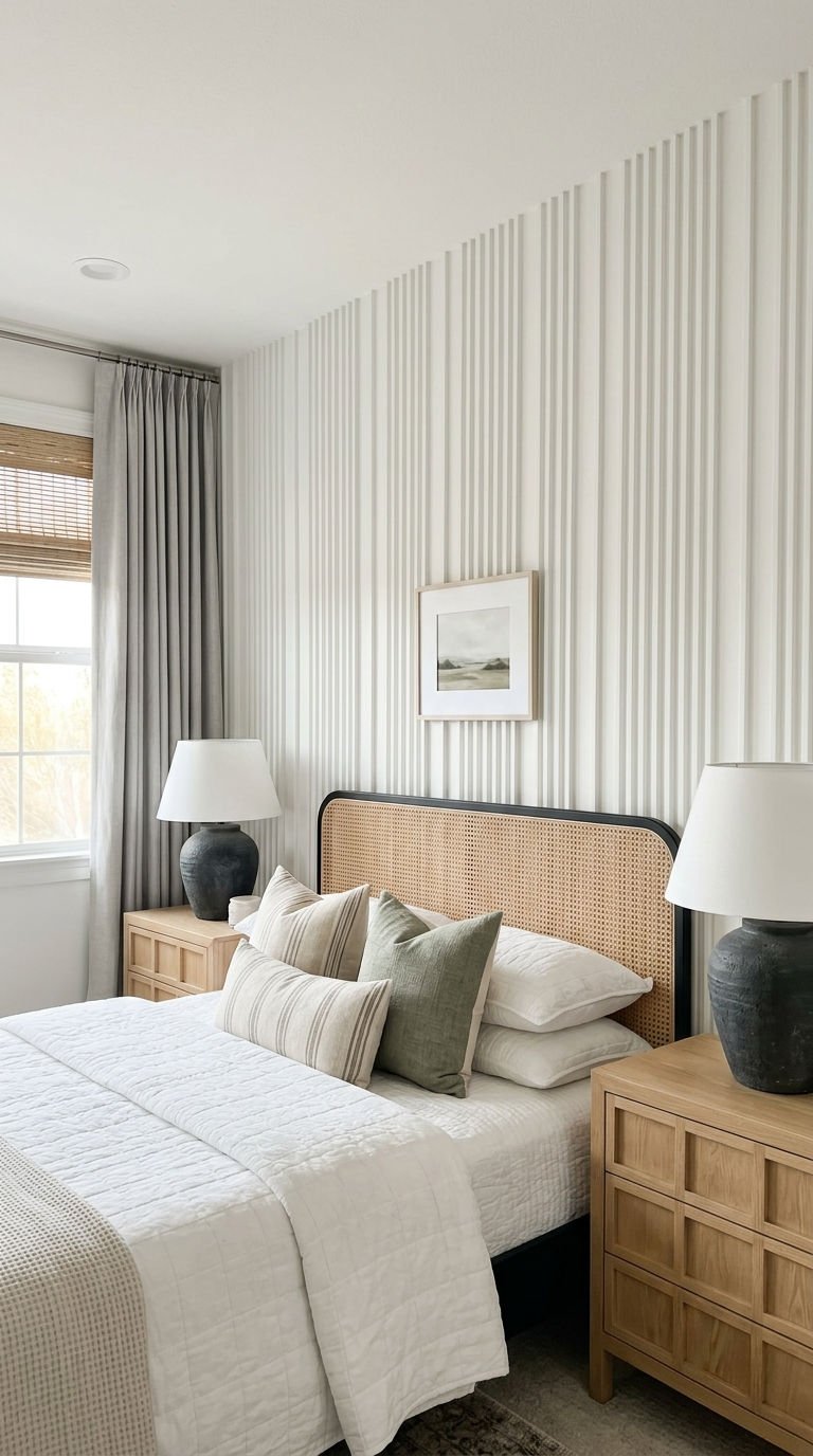 L’alignement de fines baguettes verticales crée une texture tactile et visuelle d’une grande délicatesse. Cette forme minimaliste de moulure murale moderne apporte du relief sans surcharger la chambre, se mariant parfaitement avec des matières naturelles comme le rotin.