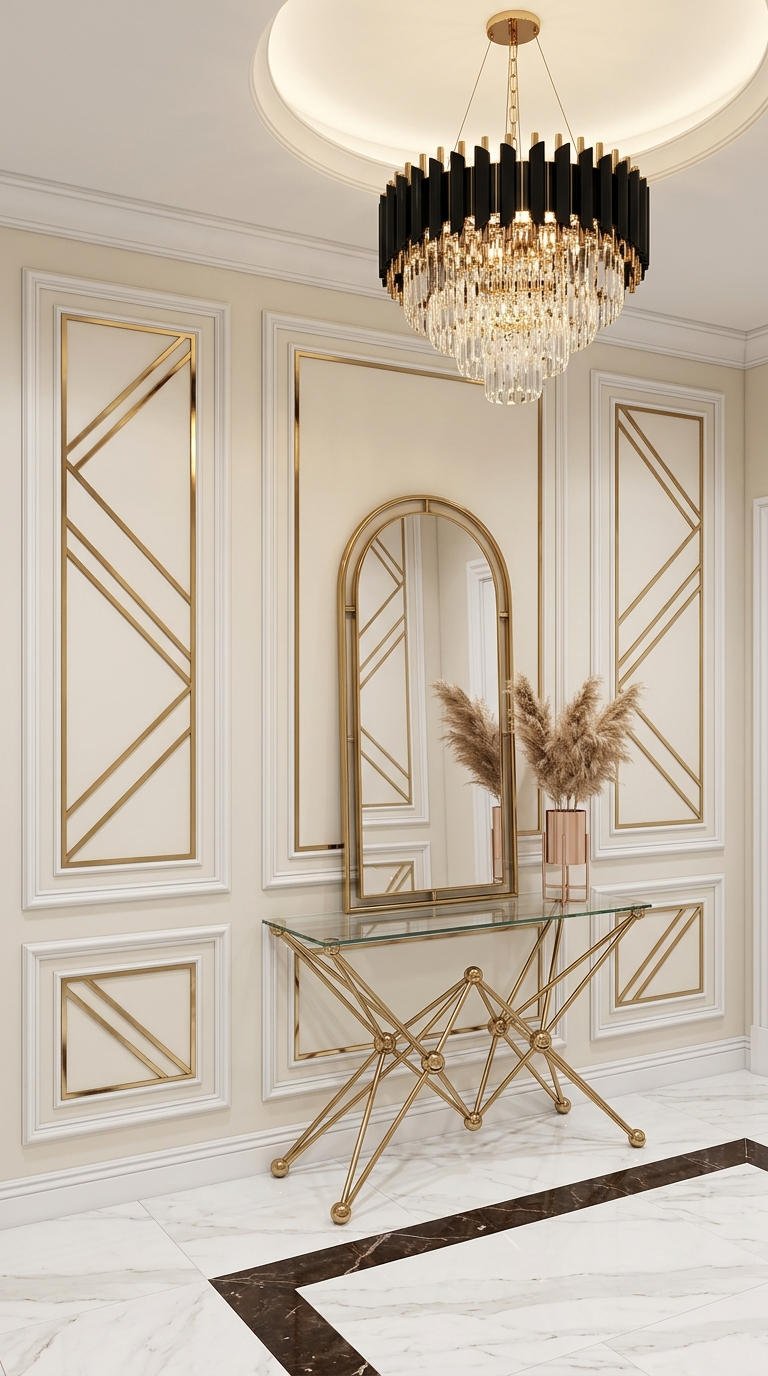 L’intégration de lignes métalliques asymétriques au sein d’encadrements classiques revisite le design d’intérieur dans une entrée moderne. Cette somptueuse moulure murale moderne reflète la lumière et apporte une touche résolument sculpturale, mariant habilement le style art déco au minimalisme.