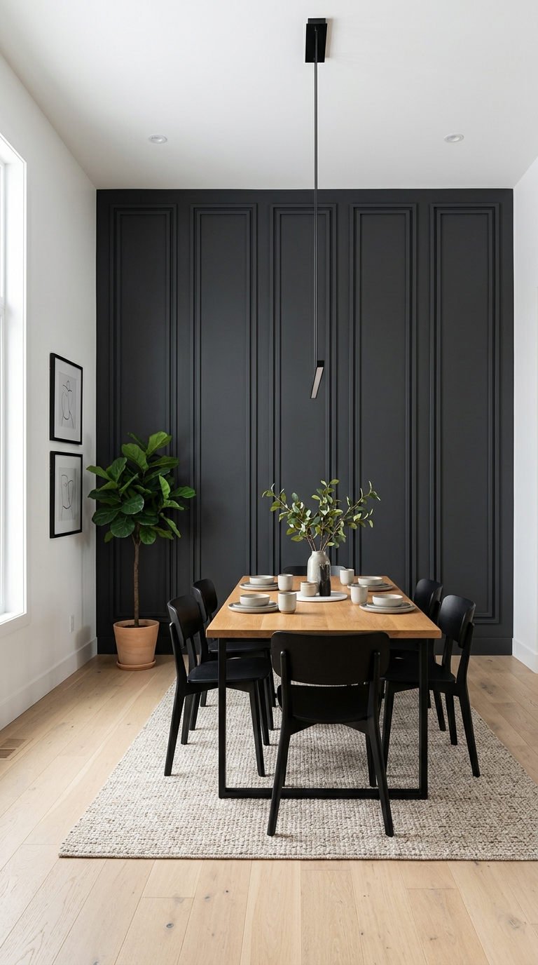 Le choix d’une finition sombre et mate confère une profondeur inouïe à la salle à manger. L’application de cette moulure murale moderne dramatique fait vibrer la chaleur naturelle du bois de la table, créant une ambiance sophistiquée et conviviale.
