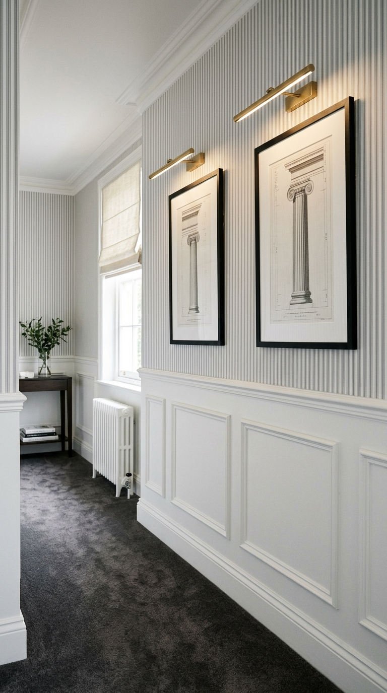 L’association d’un papier peint rayé et de soubassements en relief crée une illusion de hauteur majestueuse. La moulure murale moderne structure le couloir avec finesse, servant de cadre idéal pour exposer des gravures architecturales dans un esprit très classique.