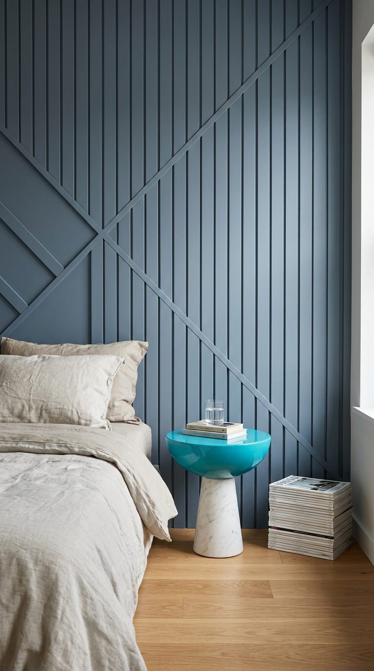 L’introduction de diagonales audacieuses par-dessus un motif nervuré vertical casse la monotonie avec brio. Cette moulure murale moderne teintée d’un bleu-gris apaisant dynamise la tête de lit, offrant une esthétique architecturale forte tout en conservant une atmosphère très relaxante.