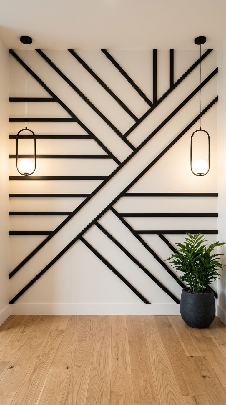 L’entrelacement de baguettes noires sur un fond blanc immaculé produit un effet visuel hypnotique. Cette approche audacieuse de la moulure murale moderne transforme une simple cloison en une œuvre d’art abstraite, parfaite pour dynamiser un espace à la décoration épurée.