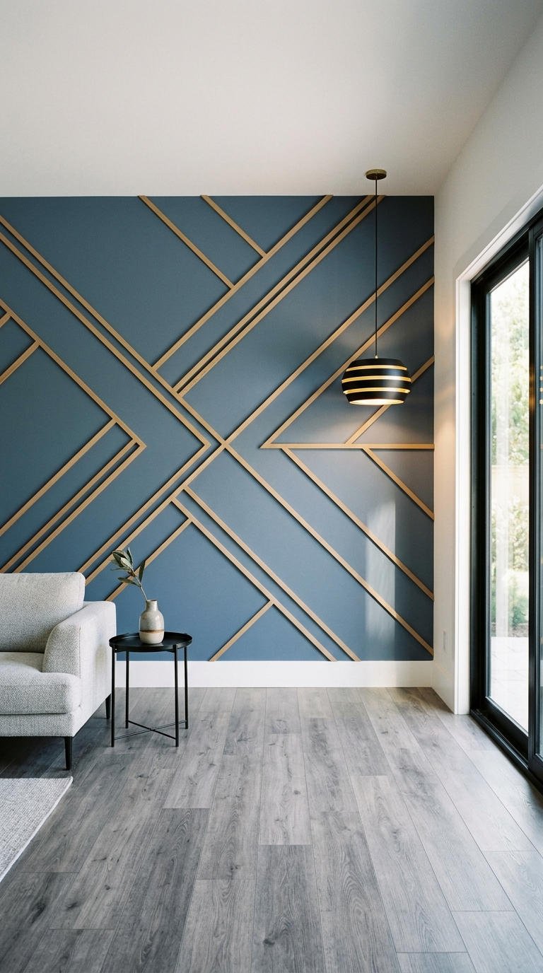 L’alliance d’un fond bleu orage et de délicats tasseaux dorés crée un décor mural spectaculaire. Cette moulure murale moderne à motif angulaire apporte une richesse visuelle incomparable, fusionnant l’art déco avec un design contemporain pour un intérieur très chic.