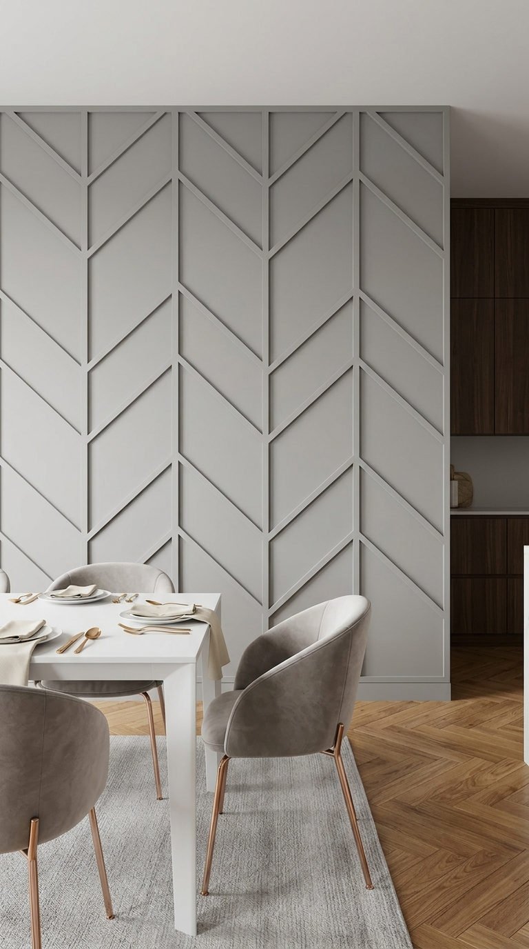 Le motif en flèche, traditionnellement réservé aux parquets, investit majestueusement les murs. Cette interprétation originale de la moulure murale moderne offre une dynamique verticale ascendante, structurant la zone repas avec une texture subtile et un charme contemporain indéniable.