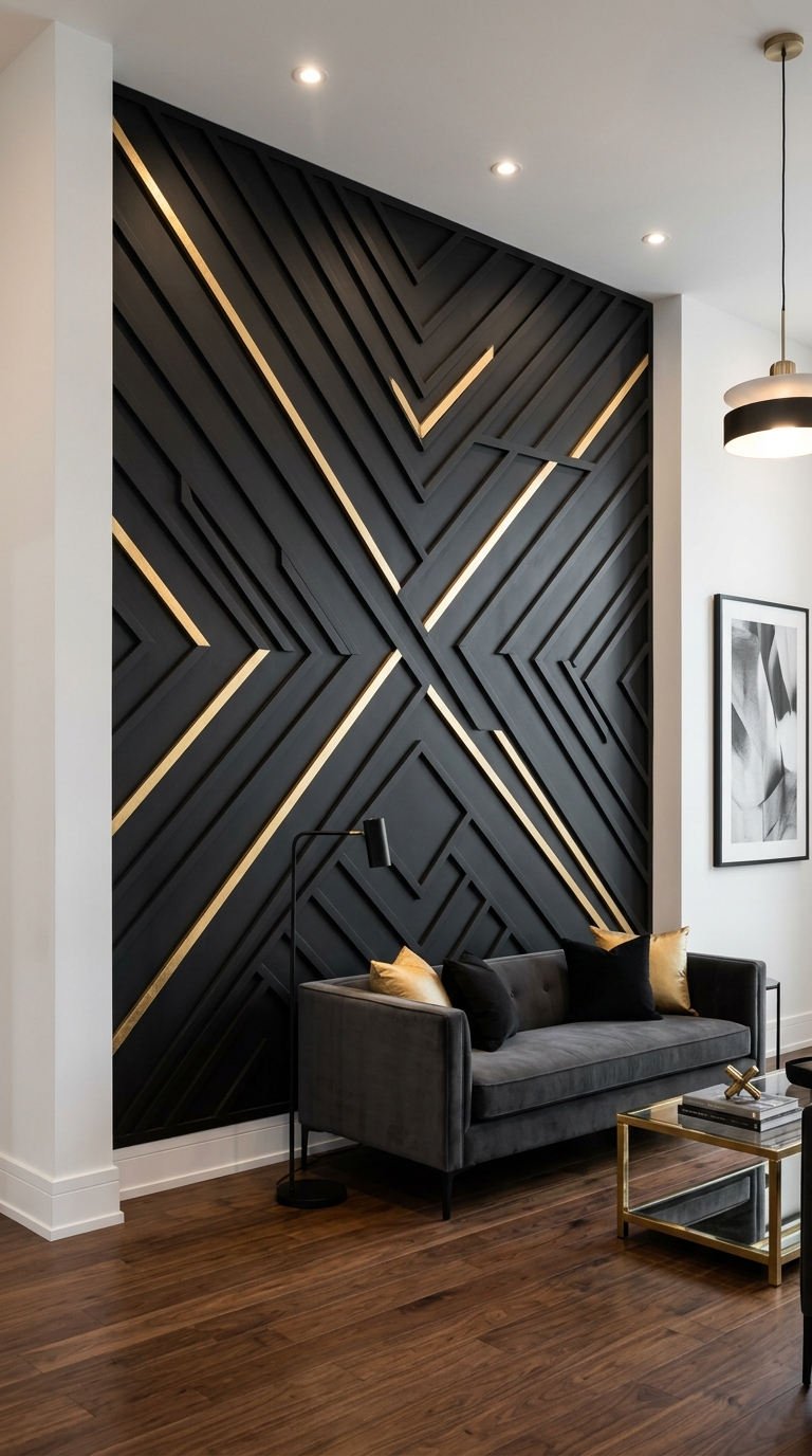 Un design asymétrique aux lignes métalliques étincelantes sur fond noir mat crée un impact visuel foudroyant. Cette moulure murale moderne audacieuse s’impose comme le joyau du salon, conférant une atmosphère ultra-luxueuse et un caractère affirmé à l’ensemble du décor.
