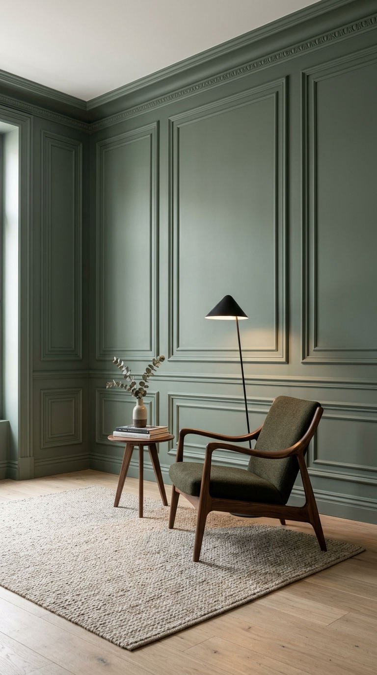Enveloppez votre espace de sérénité grâce à cette nuance végétale apaisante. L’utilisation d’une peinture unie sur la moulure murale moderne accentue la profondeur de la pièce, fusionnant le charme d’antan avec une atmosphère naturelle propice à la détente absolue.